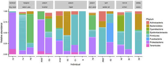 - Shiffman, M.E.; Soo, R.M.; Dennis, P.G.; Morrison, M.; Tyson, G.W.; Hugenholtz, P. Gene and genome-centric analyses of koala and wombat fecal microbiomes point to metabolic specialization for Eucalyptus digestion. PeerJ 2017, 5, e4075. [Google Scholar] [PubMed]