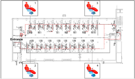Dental unit waterline (DUWL) map; the main water pipeline is marked in red.