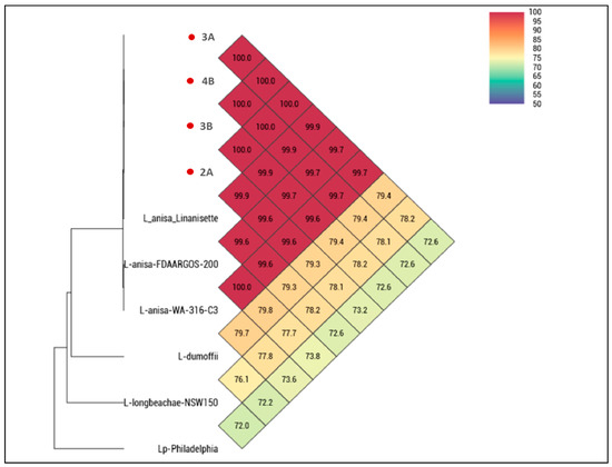 The water samples were analyzed for Legionella spp. by standard culture techniques according to the Dutch guideline or Nederland Norm (NEN) 6265, as follows: 250 mL of water sample were filtered through a polyether sulfone membrane with a porosity of 0.2 µm (Pall Life Sciences, Ann Arbor, MI, USA). The intact membranes were aseptically removed, placed into sterile 50 mL screw-capped tubes, and re-suspended in 10 mL of the original water samples. Each concentrated water sample was sonicated for five minutes to dislodge bacterial cells from the membranes. The cell suspension was placed in a 50 °C water bath for 30 min. The heat treatment of the concentrated water samples was used as a selective method to reduce the amount of non-Legionella bacteria. An aliquot of 100 µL was aerobically cultured on buffered charcoal yeast extract (BCYE) agar supplemented with cysteine (Oxoid ThermoScientific, Basingstoke, UK) for 7 days at 35 °C (±2 °C). Species identification was done using MALDI-TOF (Bruker, Daltonik Gmbh, Bremen, Germany). To confirm the previous identification, the OrthoANI algorithm was used to confirm species identification [12] by assessing the overall similarity between our isolates and six reference genomes downloaded from the NCBI genome database (http://www.ncbi.nlm.nih.gov/genome/): three L. anisa strains (strain Linanisette NZ_CANP00000000.1; strain FDAARGOS-200 NBTX00000000.2; strain WA-316-C3 NZ_LNXS00000000.1), one Legionella dumoffii, Legionella longbeachae strain NSW150, and Legionella pneumophila strain Philadelphia, which were also used for further comparative genomic analysis. OrthoANI values were obtained, and a phylogenetic tree was constructed using the orthologous average nucleotide identity tool.