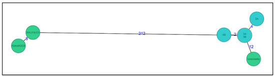 Minimum spanning tree of four L. anisa isolates (light blue) (named as 2A, 3A, 3B, and 4B) from dental chairs and three reference genomes (green) from NCBI database (RefSeq: NZ_CANP00000000.1; RefSeq: NZ_NBTX00000000.1; RefSeq: NZ_LNXS00000000.1) (named as Linanisette, FDARGOS_200, and WA-316-C3). Distance based on a cgMLST of 3140 genes and 540 accessory genes (wgMLST, 3680 genes) using the parameter “pairwise ignoring missing values” during calculation.