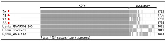 The pan genome analysis showed that our isolates and the reference L. anisa strains shared the same core genome (Figure 4). However, regarding the accessory genes, strain 2A differed significantly from the other 3 isolates. The number of protein-coding gene sequence clusters was different in each isolate found in this study, ranging from 3736 to 3786. By looking at the accessory clusters, we can infer that the isolates from this study showed more similarities with the strain Linanisette compared to the other reference strains.