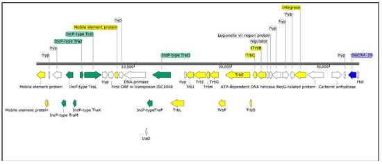 Schematic representation of blaOXA-29 resistance gene (blue) located downstream to an integrated plasmid (IncP type) (green) containing a transposon machinery (yellow).