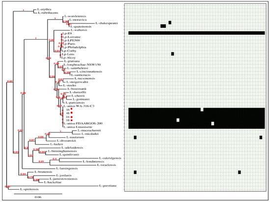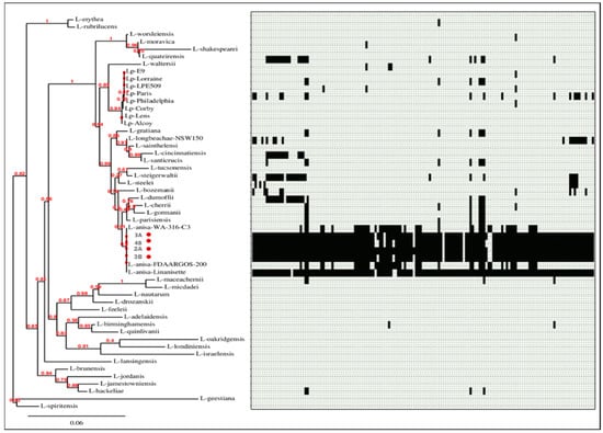 Phylogenetic tree of 53 Legionella genomes and SeqFindr presence/absence matrix of plasmid p2 (black color indicates presence, and light grey color indicates absence). The isolates from this study are marked in red.
