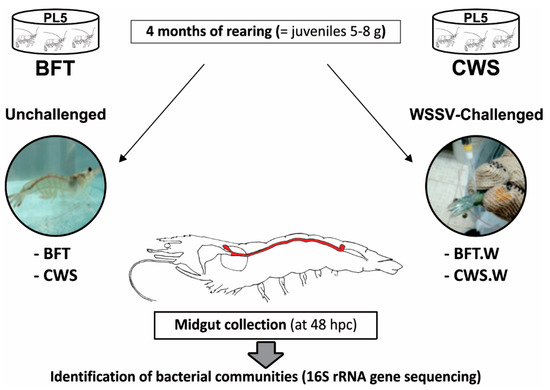 Post-larvae stage 5 (PL5 = five-day-old) from lineage HB12 of Litopenaeus vannamei were cultivated during four months in two culture systems: Biofloc Technology (BFT) (4 tanks) and clear seawater system (CWS) (4 tanks), at an initial stocking density of 300 and 20 PL5.m−3, respectively. White spot syndrome virus (WSSV)-free juvenile shrimp (5–8 g) from each condition (n = 80) were individually challenged with WSSV by the oral route (5 × 106 genome viral copies). The remaining animals (n = 40/condition) were not handled. At 48 h post-challenge (hpc), midguts from unchallenged (BFT and CWS) and WSSV-challenged (BFT.W and CWS.W) shrimp (n = 40/condition) were collected and processed for 16S RNA gene sequencing.