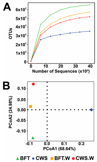 Sequencing coverage analysis by rarefaction curve (A) and Principle coordinate analysis (B) indicating the similarities and dissimilarities between bacterial communities present in the midgut of Litopenaeus vannamei reared in two different rearing systems (BFT: biofloc; CWS: clear seawater) and after an oral challenge by the White spot syndrome virus (BFT.W: shrimp reared in BFT and challenged by the WSSV; CWS.W: shrimp reared in CWS and challenged by the WSSV).