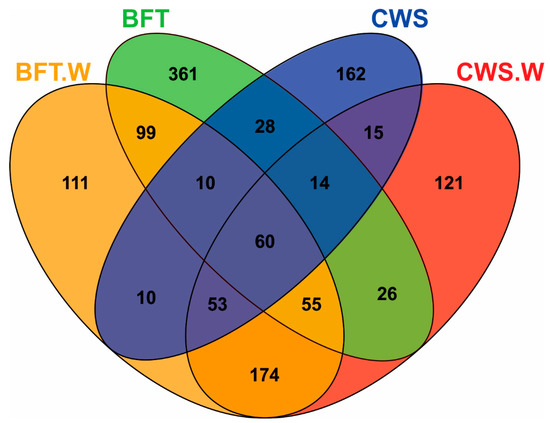 Venn diagram showing unique and shared operational taxonomic units (OTUs) of midgut bacteria of Litopenaeus vannamei reared in biofloc (BFT) and clear seawater (CWS) and challenged by the WSSV (BFT.W and CWS.W), by using a per os method.