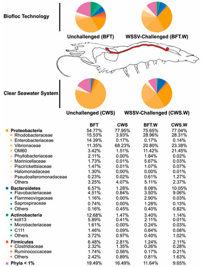 Relative abundance of the most prevalent bacterial phyla and families identified in the midgut of Litopenaeus vannamei (highlighted in red in the not-to-scale image) reared in biofloc (BFT) and clear seawater (CWS), and at 48 h after an oral challenge by the White spot syndrome virus (BFT.W and CWS.W).