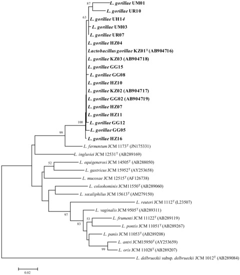 - Tsuchida, S.; Nezuo, M.; Tsukahara, M.; Ogura, Y.; Hayashi, T.; Ushida, K. Draft genome sequence of Lactobacillus gorillae Strain KZ01T, isolated from a Western Lowland Gorilla. Genome Announc. 2015, 3, e01196-15. [Google Scholar] [CrossRef] [PubMed]