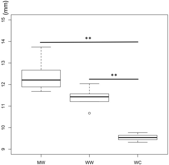 Antimicrobial activities of strains from gorillas. MW—strains from wild mountain gorillas (n = 5); WW—strains from wild western lowland gorillas (n = 5); WC—strains from captive western lowland gorillas (n = 8). In the box plot, the line in the middle of the box represents the median; the upper and lower perimeters of the box represents the 75th and 25th centiles, respectively; and the tails represent 2.5th and 97.5th centiles, respectively. ** p < 0.01.