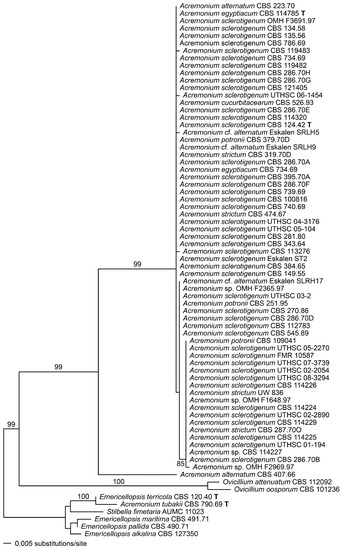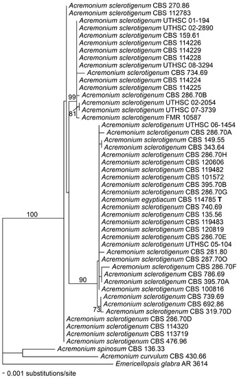 Phylogenetic disposition of the Acremonium sclerotigenum/egyptiacum complex as shown by complete ribosomal internal transcribed spacer (ITS) sequences analysed using maximum likelihood (ML) with RAxML VI-HPC. Support values were obtained using a fast bootstrap analysis of 1000 pseudoreplicates. Members of the Emericellopsis-Stilbella complex are used as an outgroup.