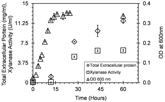 The growth, total extracellular protein, and xylanase activity profile of Geobacillus sp. strain DUSELR13 grown on 0.05% (w/v) xylan as the substrate at 60 °C. The values are the means of three set of experiments and the error bars represent ± SD of the means with n = 3.
