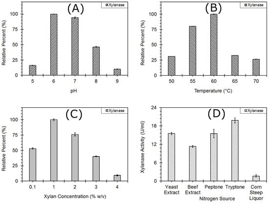(A) The effect of growth pH profile on the xylanase activity of Geobacillus sp. strain DUSELR13. The maximum enzyme activity (8.54 U/mL) is taken as 100%; (B) the effect of growth temperature profile on the xylanase activity of Geobacillus sp. strain DUSELR13. The maximum enzyme activity (9.23 U/mL) is taken as 100%; (C) the effect of xylan concentration on the xylanase activity of Geobacillus sp. strain DUSELR13. The maximum enzyme activity (17.4 U/mL) is taken as 100%; and (D) the effect of nitrogen source on the xylanase activity of Geobacillus sp. strain DUSELR13. Values shown were the mean of triplicate experiments and the error bars represent ± SD of the means with n = 3.