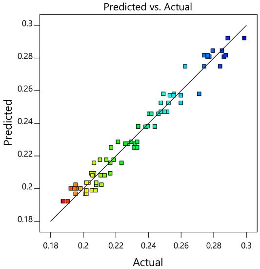 Surface response plot for predicted vs. actual values. The concentration of the data points near the straight line shows high correlation, and adequate precision. The blue color represents the minimum value, whereas the red color represents the maximum value. The rest of the color represents a range between the colors red, and blue. Each square represents the experimental value obtained from the runs.