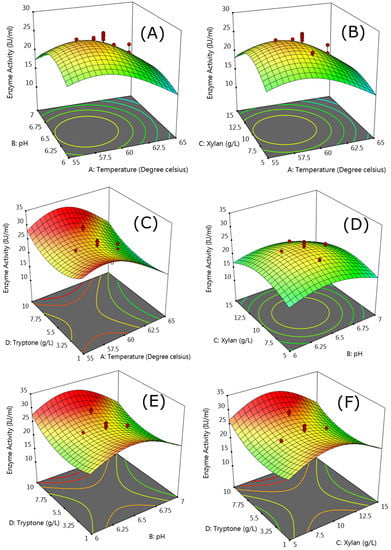 Response surface 3D response plots showing interaction between (A) temperature and pH, (B) temperature and xylan, (C) temperature and tryptone, (D) pH and xylan, (E) pH and tryptone, and (F) xylan and tryptone. The green color represents the minimum value whereas the red color represents the maximum values. The points above or below the response surface area respectively represent the values which are higher or lower than the predicted response value for the enzymatic activity.