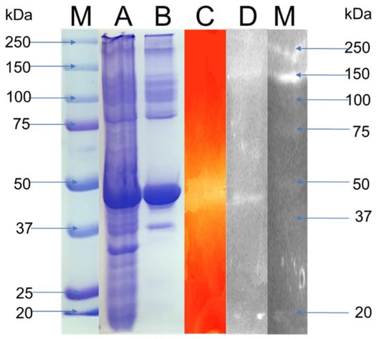 SDS PAGE, and zymogram analysis of the xylanase resolved on the 12.5% polyacrylamide gel. Lane M: Biorad precision plus standard protein marker; lane A: Crude enzyme; lane B Concentrated supernatant; lane C: Zymogram for the xylanase; lane D: SDS PAGE analysis of the xylanase grown on PCG with silver staining.