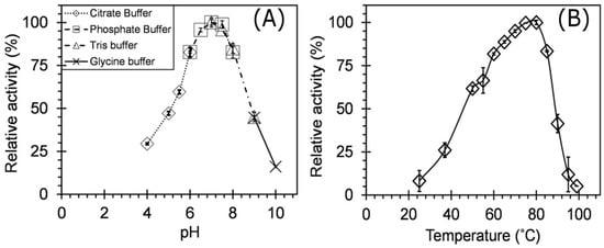 The effect of pH (A), and temperature (B) on the xylanase activity of Geobacillus sp. strain DUSELR13. The maximum enzyme activity is taken as 100%. The values shown are the mean of triplicate experiments and the error bars represent ± SD of the means with n = 3.