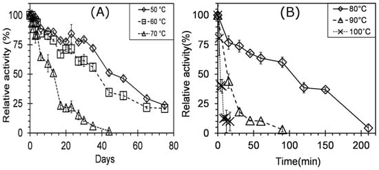 Thermal stability profiling of the xylanase produced by Geobacillus sp. strain DUSELR13 at different temperatures (A) 50–70 °C and (B) 80–100 °C. The enzyme activity is expressed as the percentage of the initial activity that is taken as 100%. The values are mean of triplicate experiments and the error bars represent ± SD of the means with n = 3.