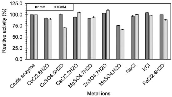 The enzyme activity is often affected by the presence of metal ions in the complex substrate (e.g., food waste, agricultural and forestry residues), or the medium. The metal ions either serve as the catalytic center of the enzymes, acts as the bridge to bring the enzyme and substrate in close proximity or maintain other physiological functions []. Hence, the effect of different metal ions on the xylanase activity was determined at 1mM and 10mM concentrations (Figure 9). The xylanase activity on the crude xylanase grown with xylan as the substrate without any external metal ion addition was taken as 100%, and all the relative activities were measured against it. At 1 mM concentration the addition of Cu+2, Zn+2, K+, and Fe+2 showed an increase in the endoxylanase activity, but Na+, Mg+2, and Ca+2 resulted in the decrease of xylanase activity. However, at 10mM Ca+2, Zn+2, Na+, and Mg+2 had a positive effect on the xylanase activity, but Cu+2, K+, and Fe+2 reduced the activity of the xylanase. Co+2 and Mn+2 decreased the xylanase activity at both the concentrations, but the observed decrease was more with Mn+2 as the concentration increased from 1 mM to 10 mM. Maximum increase in the xylanase activity, with the increase in the metal ion concentration from 1mM to 10mM, was observed with addition of CaCl2, where the relative activity increased from 94.6% to 105.7%. On the contrary, maximum decrease was observed with the addition of CuSO4, where it decreased from 101.4% to 70.7%.
