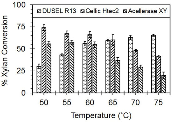 The thermostable enzymes have been considered with potential to improve the current high temperature fermentative industrial processes. The hydrolytic potential of the xylanase from DUSELR13 was compared to its commercial counterpart Cellic Htec2 [] and Accellerase XY at their operationally stable conditions. Accellerase XY has an operational stability in the range of 50–75 °C, and pH 4.5 and 7.0 [], and Cellic HTec 2 has also showed activity at a temperature range of 50–75 °C, and pH 4.5 and 6.75. Figure 10 shows the hydrolysis of the beechwood xylan by the DUSELR13 crude xylanase, and its commercial counterparts. The percentage conversions were calculated on the basis of reducing sugars released from 1 g beechwood xylan. The maximum amount of sugar that can be obtained with xylan hydrolysis under ideal conditions where complete hydrolysis occurs was taken as 100%. The xylanase from DUSELR13 converted more xylan into sugars at high temperature whereas the commercial counterparts showed higher percentage of xylan hydrolysis at relatively lower temperatures. At 75 °C, DUSEL R13 xylanase hydrolyzed 65.4% of the beechwood xylan, whereas Cellic HTec2, and Accellerase XY respectively showed only 41.8%, and 20% hydrolysis. However, at lower temperature the hydrolysis by DUSELR13 was lower in comparison to that obtained with Cellic HTec2, and Accellerase XY. At 50 °C, the xylanase from DUSELR13 showed only 30% xylan hydrolysis in comparison to 74%, and 55.8% respectively by Cellic HTec2 and Accellerase XY. The hydrolysis rate for DUSELR13 increased significantly from 55 to 60 °C, but the change was not that significant from 60 to 75 °C. This was also observed during the Topt for the xylanase activity in Figure 5B, where the increase in the xylanase activity showed similar trend. On the other hand, the xylanase activity for Cellic HTec2 reduced significantly from 55 to 75 °C. With increase in temperature to 75 °C, the xylan hydrolysis by DUSELR13 increased 1.52 times to 65.4%, however, for Cellic HTec2, and Accellerase XY respectively it reduced 1.77 times to 41.8%, and 2.79 times to 20%.