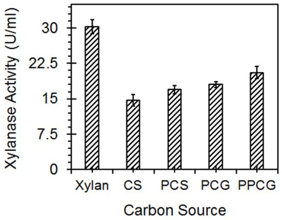 Hemicellulose, which forms about 30–40% of the lignocellulosic biomass (LCB) is mainly constituted by xylan. Xylan is a polysaccharide made up of β-1,4-xylose units or β-1,4-mannose units, and has substitutions of arabinose, methylglucuronic acid, and acetate [,]. The complex chemical composition of xylan requires a concerted action of several enzymes, collectively known as hemicellulases, including endo-β-d-xylanases, β-d-xylosidases, α-l-arabinofuranosidases, α-d-glucuronidases, acetylxylan esterases, ferulic and p-coumaric acid esterases. These enzymes act synergistically on the linear chain as well as on the side chains giving xylose and xylooligosaccharides (XOS) as the end products [,]. Among the various enzymes required for the effective hydrolysis of xylan component of biomass, endo-1,4-β-xylanase (simply referred to as xylanase), is an essential enzyme that acts on the xylan backbone of the hemicellulose with high specificity, negligible substrate loss, and side products [] compared to the prevalent chemical methods of hydrolysis.
