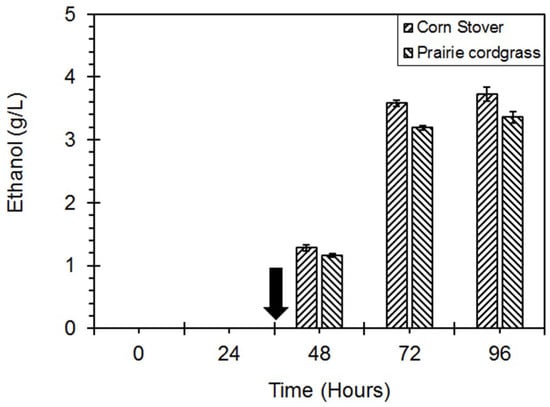 Five percent (w/v) of thermo-mechanically treated insoluble corn stover and prairie cordgrass [] were used for ethanol production in 500-mL Erlenmeyer flasks. The flasks were inoculated with Geobacillus sp. strain DUSELR13 at time 0 h, and with Geobacillus thermoglucosidasius at time 36 h. An ethanol yield of 3.53 g/L (0.21 g/g PCG utilized) and 3.72 g/L (0.2 g/g CS utilized), respectively were obtained with prairie cordgrass and corn stover (Figure 12). The material balance showed that 90.5 and 91.6% of the mass was recovered during the process, converting 62.4 and 57.4% energy respectively in prairie cordgrass and corn stover to ethanol (Table 5). The ethanol productivity obtained was 0.059 (g/L/h) and 0.62 (g/L/h) with Corn Stover and prairie cordgrass, respectively.