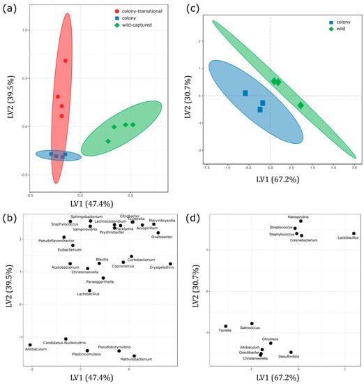 Eleven phyla were identified in fecal samples with no significant differences in relative abundance between colony, colony-transitional, and wild-captured diet groups. All samples were dominated by Bacteroidetes and Firmicutes (Figure 1, Supplementary Table S3). The most dominant taxon at each taxonomic level was the same for all diet groups, although there were significant differences observed in lower taxonomic levels and low-abundance taxa (<1%) (Supplementary Tables S3–S7). When captive-reared voles were switched from the colony diet to the colony-transitional diet, unexpectedly there were few shifts in relative abundance and any that were significantly different were in low abundance taxa (<5%). Most significant differences were noted when comparing wild-captured and colony samples. We performed PLS-DA using genus-level abundance data to investigate signatures related to each diet. PLS-DA discriminated genera based on VIP (variable importance in projection) scores showing which taxa contributed most to separation of the diet groups as shown by score and loadings scatterplots (Figure 2a,b; Supplementary Table S8). Colony and colony-transitional samples did slightly cluster away from wild-captured samples. Based on VIP scores and the five most important genera for discriminating the diet groups were Erysipelothrix, Sphingobacterium, Acetobacterium, Azospirillum, and Vampirovibrio, all of which were present in low abundances (Supplementary Table S8).