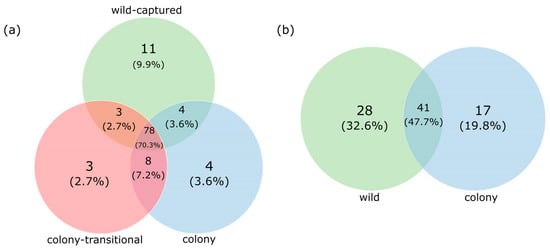 Based on a Venn diagram comparing core gut microbiota in colony, colony-transitional, and wild-captured fecal samples, including very low-abundance taxa, 70.3% of OTUs were shared by all diet groups (Figure 3a). When filtered to exclude taxa present at less than 0.05% abundance, 96.2% of OTUs were shared by all diet groups in the feces (Supplementary Figure S1a).