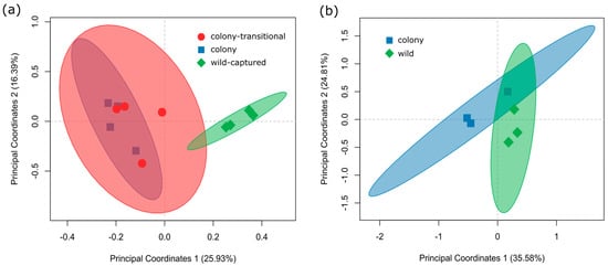 Bray-Curtis distances showed that wild-captured samples clustered on their own while colony and colony-transitional samples clustered together (Figure 4a). This is in line with previous studies that show different microbial diversity and community structure in captive vs wild conspecifics [,,,]. PLS-DA analysis also indicated separation of wild-captured samples (Figure 2a). The five genera that contributed most to PLS-DA separation according to VIP scores were present at very low-abundance in all diets (<0.5%) and are typically found in association with soil, water, plant roots, or algae [,,,,] (Supplementary Table S8). This suggests that exposure to environmental wetland features prior to capture is likely an important source of commensal bacteria or host-associated microbiota, thus driving the separation of wild-captured samples from colony and colony-transitional samples in our analyses.