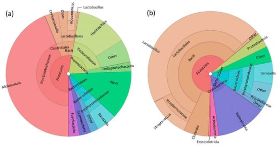 Cladogram-style pie charts (Krona charts) showing the average relative abundance of taxa in (a) colony and (b) wild foregut samples. All ‘other’ categories in each chart encompass taxa present at <1% abundance.