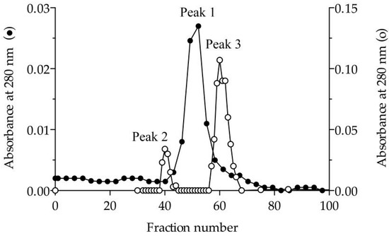 Elution profile in size-exclusion chromatography. Sephacryl S200 column (1.6×60 cm) equilibrated in 25 mM Tris-HCl (pH 7.5) containing 150 mM NaCl in the absence (●) and presence (○) of 1% (w/v) sodium cholate. Peak 1 corresponds to dimeric Lip3 (117 kDa). Peak 2 and peak 3 correspond to a high molecular weight lipase-cholate aggregate and monomeric Lip3 (60 kDa), respectively. Loaded sample: Dimeric Lip3. Flow: 0.3 mL/min. Fractions: 3 mL.