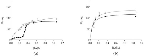 Dependence of specific activity of dLip3 (○) and mLip3 (●) on triacetin concentration in the absence (a) and presence (b) of 25% (v/v) hexane. The assays were performed at 30 °C and pH 7.0. Triacetin concentration: From 35 mM–1.06 M. Lipase concentration: 80 µM. Triacetin solubility limit was 270 mM. Data from mLip3 series was reproduced with permission from Pernas et al. [20].