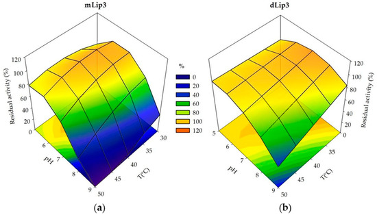Response surfaces and contour plots generated using experimental design data. (a) Residual activity of mLip3 after pH and T treatment for 30 min; (b) Residual activity of dLip3 after pH and T treatment for 1 h.