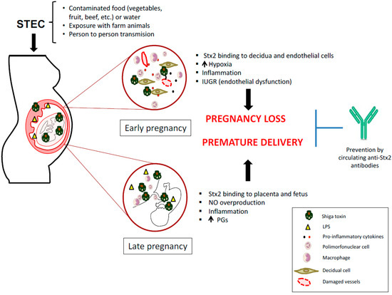 In this sense, symptomatic or asymptomatic STEC infections during early pregnancy may cause maternal or fetal damage mediated by Stx2. In consequence, STEC infection during pregnancy may cause maternal or fetal damage mediated by Stx2. These data support the hypothesis that similar events may occur during human pregnancy (Figure 1).