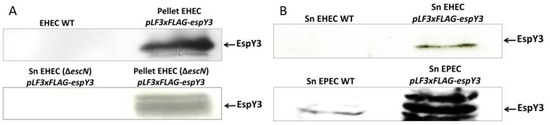 The expression and subsequent secretion of the recombinant effector through T3SS was assessed by growing strains EHEC O157:H7 EDL933, EPEC O127:H6 E2348/69, and EHEC O157:H7 Rafaela II (T3SS mutant) transformed with pLF-3xFLAG-espY3 in DMEM, with 0.5 mM of Isopropyl β-D-1-thiogalactopyranoside (IPTG). After 4 h of incubation under agitation (200 rpm) at 37 °C, the cultures were centrifuged at 10,000 rpm for 10 min at 4 °C. The supernatants were filtered (0.22 µm pore-size) and the proteins were precipitated with trichloroacetic (TCA) or acetone at a final concentration of 10% v/v, followed by incubation at −20 °C for 16 h. The supernatants were centrifuged at 10,000 rpm for 20 min at 4 °C. Then, the secreted proteins were resuspended in Tris-HCl pH 8.8 and SDS 2× loading buffer was added to the resuspended proteins. The recombinant protein was detected using 1:2000 anti-FLAG mouse specific antibodies and 1:10,000 peroxidase conjugated goat anti-mouse IgG as secondary antibody in Western blot assays.