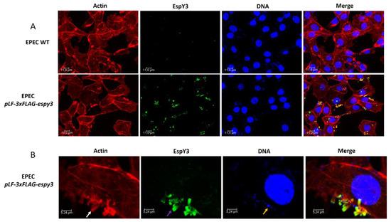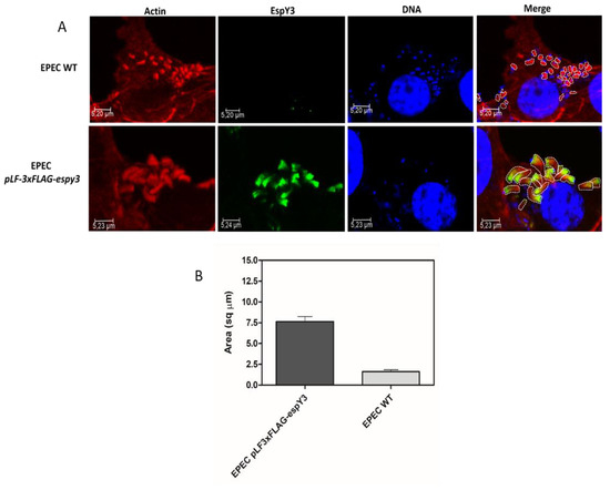 Human epithelial colorectal adenocarcinoma cells (Caco-2) were grown in DMEM supplemented with 10% heat-inactivated fetal bovine serum and 2 mM glutamine, at 37 °C with 5% CO2 in a glass support (Nunc® Lab-Tek® II Chamber Slide ™ system, SIGMA-ALDRICH, Boston EEUU) up to 70–90% confluence. For the translocation assay, 5 ×104 cells per well were seeded in 8-well plates and incubated for 24 h at 37 °C with 5% CO2. EHEC O157:H7 EDL933 and EPEC O127:H6 E2348/69 transformed with pLF-3xFLAG-espY3 were grown in LB broth overnight, and then diluted in 400 µL of DMEM with 1 mM of IPTG, at a multiplicity of infection (MOI) of 100 or 5 for EHEC and EPEC, respectively. Caco-2 cells were infected for 4–5 h at 37 °C in 5% CO2, and then gently washed three times with PBS to remove non-adherent bacteria. After that, the cells were fixed with 4% paraformaldehyde during 5 min. cellular actin was stained with Rhodamine-phalloidin (Red), the eukaryotic nuclei and bacterial DNA with TO-PRO-3 (Blue), and the recombinant proteins were detected using anti-FLAG mouse specific antibodies and Alexa 488-conjugated goat anti-mouse IgG as secondary antibody (Green). The area of the pedestals was determined by observing 15 randomized fields in triplicate for each sample. The Image J software was used to delineate and calculate the pedestals area generated by both strains. The cells were observed under fluorescence microscopy with a confocal laser microscope (40× objective-Leica TCS SP5- CICVyA-INTA).