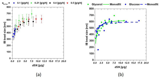 with mC [g] being the fed mass of C-source, dt [h] the respective time interval and X(t0) [g] the total biomass at the start of induction. The induction time scale can now be exchanged for the dSn value during the induction phase. Low qs,C values result in a low dSn value, while high qs,C increases the values, as a high amount of C-source is fed throughout the process. The interaction between the IB bead size and dSn is presented in Figure 2a, comparing four runs with glycerol as C-source. Single bead size was strongly affected by the fed substrate starting with about 350 nm (threshold of the measurement principle) to a size over 600 nm in mean. A modified hyperbolic kinetic term could be used to describe this behavior of the mean diameters of the IBs in Equation (3):