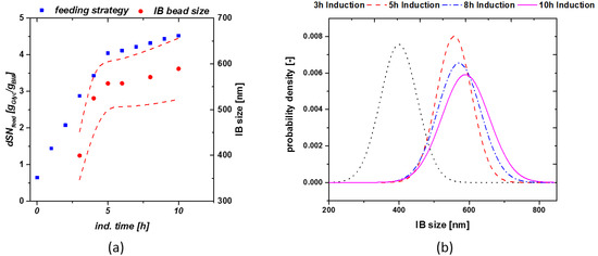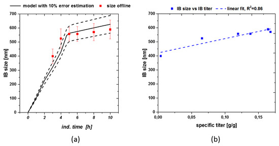 Size was well described by the model, resulting in only small variations, still lying within the standard deviation. Using the given model size estimation down to the beginning of the induction phase can be made, even if no analytical method is available for direct determination (e.g., SEM threshold). As size and titer show a linear correlation (compare to Figure 4b) overall product formation can be increased, applying the qs,C shift from 0.5 to 0.1 g/g/h. Therefore, also titer could be estimated for a fixed process based on the presented model approach. Standard deviation of IB-bead size (plotted in Figure 3a also increases over time, which is in correlation with literature [42].