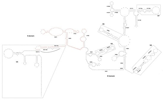 The II and III domains of the 18S secondary structure of gregarines isolated from T. molitor and Z. atratus midgut. In red, the portion of the rDNA fragment missing in the gene “variant” detected in Z. atratus. Nomenclature of helices and variable regions as in [24].