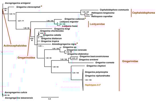 Following the tree topologies, the taxon Gregarinidae resulted to be paraphyletic, since it includes all the species of the family Gregarinidae, except for G. ctenocephali and G. cubensis. The sister group of the taxon Gregarinidae includes species of the family Leidyanidae plus G. cubensis; accordingly, we can consider this cluster as polyphyletic because it groups members that do not share a more recent common ancestor (Figure 3). This ambiguous classification has been already identified by other works [11,35], in which it has been highlighted the need for a systematic rearrangement of this clade. Indeed, Leidyana migrator and Leidyana haasi substantially differ from Leidyana erratica, which is the type species of the family Leidyanidae. Leidyana migrator and L. haasi are both described from Blaberidae cockroaches, Gromphadorina portentosa and Neisseria cinerea respectively, similarly to G. cubensis, isolated from another cockroach species, Blaberus discoidalis. Considering these characteristics and the phylogenetic distance of L. migrator and L. haasi with the other members of the family Leidynidae [11,35], it comes to light the need for a new genus description.