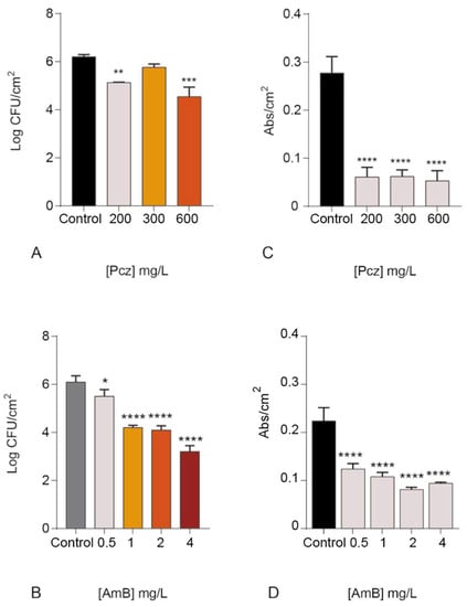 Standardized cell suspensions (1 × 105 cells/mL) were placed into selected wells of 96-wells polystyrene microtiter plates (200 μL) (Orange Scientific, Braine-l`Alleud, Belgium). RPMI-1640 was used without cells, but with an antifungal agent as a negative control. As positive control, cell suspensions were tested without an antifungal agent. At 24 h, 100 μL of RPMI 1640 was removed and an equal volume of fresh RPMI 1640 plus the antifungal concentration were added (Pcz: 200; 300 and 600 mg/L; AmB: 0.5; 1; 2; and 4 mg/L, 2 × concentrated). The plates were incubated at 37 °C for an additional 24 h at 120 rpm. The number of cultivable cells on biofilms was determined by the enumeration of CFUs. To achieve this, the mediums were aspirated, and biofilms were washed once with 200 μL of PBS to remove non-adherent cells. Then, biofilms were scraped from the wells and the suspensions were vigorously vortexed for 2 min to disaggregate cells from the matrix. Serial decimal dilutions in PBS were plated on SDA and incubated for 24 h at 37 °C. The results were presented as Log10 CFU per area (Log10 CFUs/cm2) [,,].