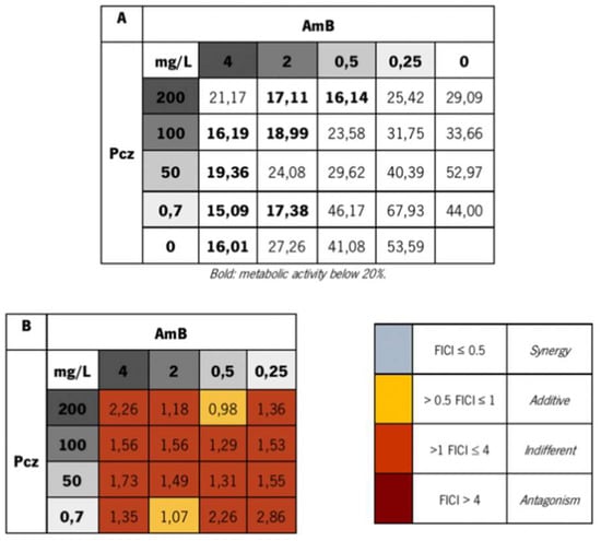 Checkerboard of the combinatory effect of different concentrations of Pcz and AmB. The values are related to the metabolic activity of the biofilms, determined through the XTT assay (A) (Bold: metabolic activity below 20%). Calculated FICI range of checkerboard experiments for C. glabrata ATCC 2001 (B).