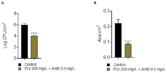 It was expected that in applying this specific combination, the reduction on biofilm cells were at least 2 Log10 CFU/cm2 and also that the biofilm biomass would diminish. Nevertheless, none of the objectives were properly achieved. The combination permitted a reduction of 2 Log10 CFU/cm2 (p < 0.0001), which was a better result than the use of Pcz alone, but did not show any clear advantages than the single use of 4 mg/L of AmB, since, in this case, the Log10 CFU/cm2 reduction was higher (2 in combination vs 2.9 AmB alone in the higher concentration applied). In fact, regarding the results of the CFU counts and comparing both drugs individually, Pcz did not reveal a pronounced effect on the eradication of biofilm cells (i.e., ≥2 Log10 CFU/cm2), applying the minimum or even the maximum dose (Figure 1A).