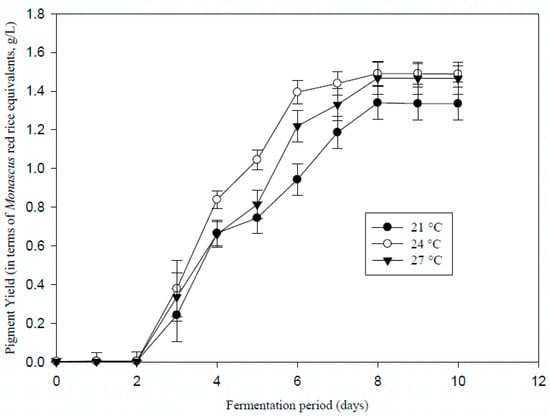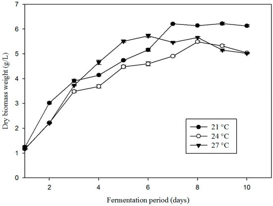For a better understanding of temperature influence on fungal growth rate and biomass production, fermentation was carried out at three different temperatures (21, 24, and 27 °C) (Figure 1).