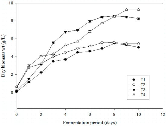 From the plotted results, it can be observed that T4 exhibited linear increase from day 1 until maximum biomass yield obtained on day 9. T2 and T3 obtained maximum biomass yield earlier on day 7. Then, there is a clear difference in the final dry biomass weights obtained in salted media, which was higher for T3 and T4. From Table 3, it is also highlighted that the final dry biomass were not significantly different from T1 or T2. Thus, the addition of sea salts was found to significantly increase the final dry biomass weight in T. albobiverticillius 30548 from 6% and above (up to 9.22 ± 0.09 g/L), and it also had a positive impact on the growth rates.