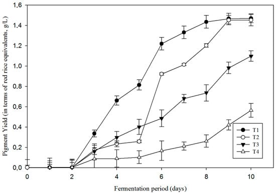 The final pigment yields were similar for treatment T1 and T2 (with a maximum value 1.46 ± 0.08 g/L). For treatment T3 and T4, the final pigment yields were significantly lower compared to the other media.