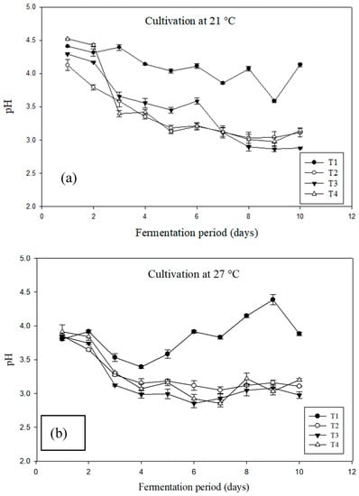 pH evolution of T. albobiverticillius strain 30548 liquid cultures grown at (a) 21 °C and (b) 27 °C with increasing concentration of sea salts (T1 0%, T2 3.65%, T3 6%, T4 9%)