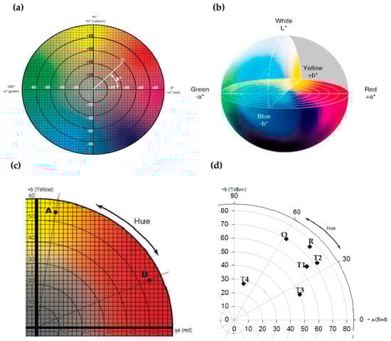 (a) CIE L*a*b* chromaticity diagram (Konica Minolta precise color communication). (b) Two dimensional L*a*b* model from CIE L*a*b* color space. (c) Representation of CIE L*a*b* colorimetric system showing the hue angles (h°). (d) Polar scatter plot showing the positions of pigments of T. albobiverticillius 30548 cultured in four different sea salt concentrated media: T1 (0%), T2 (3.65%), T3 (6%), T4 (9%) including reference standards, quinizarin (O) and Monascus red rice (R).