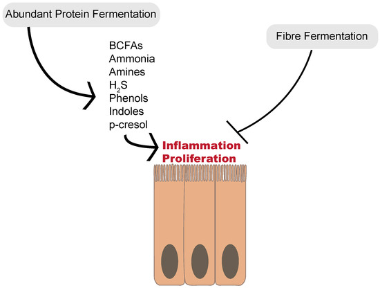 Abundant proteolytic fermentation generates a multitude of compounds that may cause the inflammation and proliferation of colonocytes, and in turn, colorectal cancer. Increased fiber fermentation and short-chain fatty acid production appears to be protective against colorectal polyp development, even when protein fermentation products are abundant.