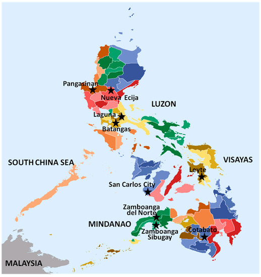 A map of the Philippines showing sampling locations of Magnaporthe oryzae isolates from various rice growing areas. Actual locations are named and indicated with a 5-point star shape.