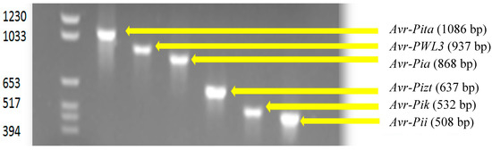 Agarose gel electrophoresis of PCR products from M. oryzae isolates tested for a specific avirulence gene.